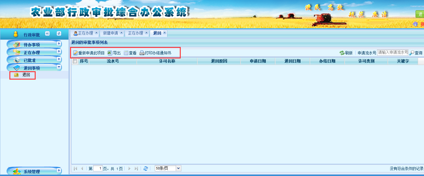 用户登录系统,点击页面左侧功能栏的“退回事项”中的“退回”,可以查看申请人所有被退回的审批事项信息,在退回页面中用户还可以进行“重新申请此项目”、“导出”、“查看”、“打印办结通知书”等操作。如下图所示: